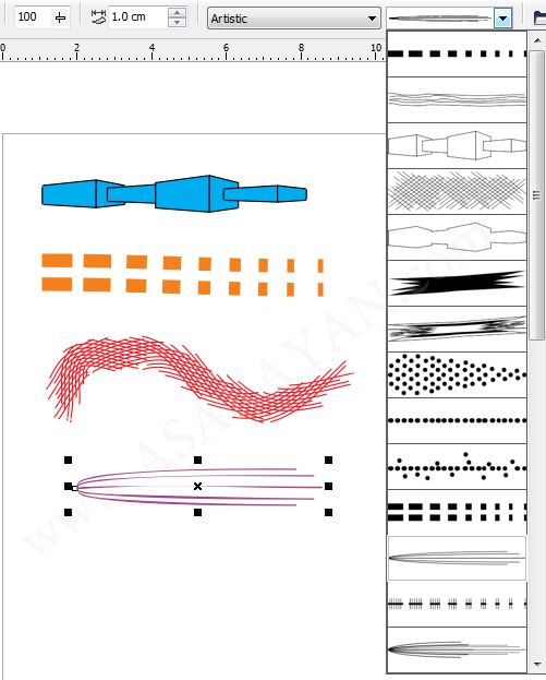 ابزار Artistic Media یک ابزار یا بهتر است بگوییم یک قلم نقاشی می باشد . شما یک سری قلم پیش فرض در لیست قلم های خود دارید که می توانید با توجه به آنها شکل های مورد نظر خودتان را در صفحه ترسیم کنید . Artistic Media شامل 5 ابزار دیگر با نام های Preset . Brush . Spayer . Calligraphic . Pressure می باشد . ( در ادامه به طور کلی هر 5 ابزار را آموزش میدهم ) خود Artistic Media زیر مجموعه ابزارهای Freehand می باشد . روش کار این ابزار به این صورت است که شما یک قلم را با رنگ مشخص در ابتدا از نوار ابزار تنظیمات انتخاب می کنید و یک خط را به صورت صاف یا منحنی در صفحه می کشید بعد مشاهده می کنید که خط کشیده شده شما تبدیل به یک خط با مشخصات انتخاب شده می شود . شما می توانید حالت های نمایش و رنگ بندی خطهای کشیده شده را نیز تغییر دهید .