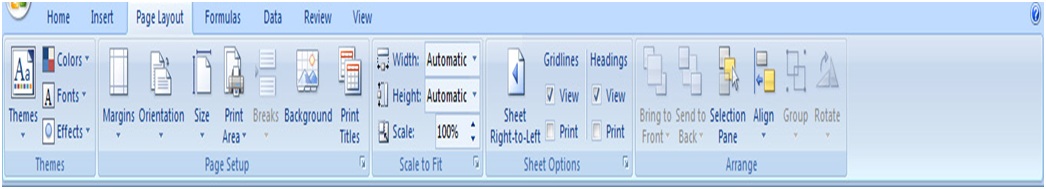 گزینه های این زبانه مربوط به تنظیمات یک صفحه در سند است. به طور کلی برای پیکربندی و بهینه سازی صفحات کاربرگ های اکسل از گزینه های این زبانه استفاده می شود.