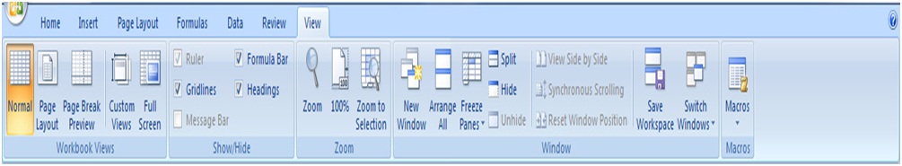 از گزینه های این زبانه برای شیوه نمایش یک سند اکسل استفاده می شود. مثلا می توان شکل نمایش صفحه را انتخاب کرد، می توان سند را در حالت بزرگنمایی تماشا کرد و... . همچنین می توان گزینه های دلخواهی را در صفحه نمایش یک سند اکسل اضافه یا حذف کرد.