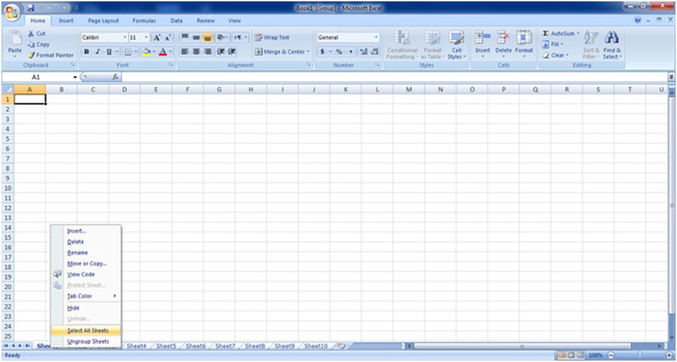 برای انتخاب تمام برگه ها، روی زبانه یکی از برگه های موجود راست کلیک کنید و از منوی باز شده، گزینه Select All Sheets را انتخاب کنید.