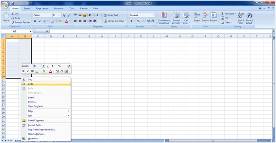 در برخی پروژه ها لازم است که میان دو برگه، ارتباط برقرار کنید. منظور از ارتباط این است که هر تغییری در مقادیر سلول های یک برگه اعمال کردید، این تغییرات به طور خودکار در برگه مرتبط با آن نیز اعمال شود. برای ارتباط اطلاعات در دو برگه، ابتدا برگه مبدا که حاوی اطلاعات است را فعال کنید. سپس سلول یا سلول هایی که می خواهید با برگه مقصد مرتبط کنید را انتخاب کرده و آنها را Copy کنید. در تصویر زیر سلول های A۱ تا A۱۰ و B۱ تا B۱۰ به منظور ارتباط انتخاب شده اند.