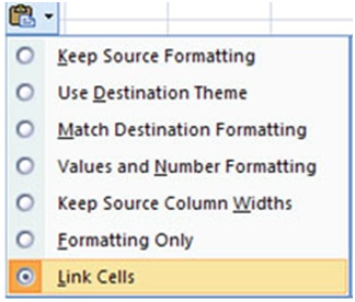 اکنون به برگه مقصد (در اینجا Sheet ۲) رفته و سپس سلول های مورد نظر را انتخاب کرده و پس از کلیک راست، گزینه Paste را انتخاب کنید. در این حالت نمادی که به Smart Tag شناخته می شود، فعال خواهد شد. بر روی این نماد کلیک کنید و سپس گزینه Link Cells را انتخاب کنید.