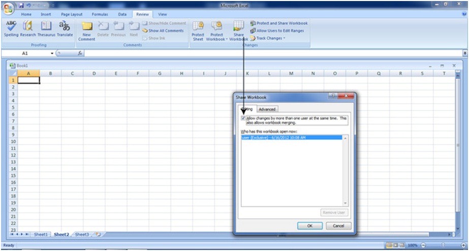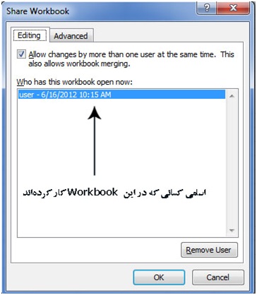 در برخی پروژه های بزرگ لازم است که چند کاربر بر روی یک Workbook کار کنند. برای اینکه یک کاربرگ را طوری تنظیم کنید که چندین نفر قادر باشند همزمان بر روی آن کار کنند، ابتدا از زبانه Review و از بخش Changes بر روی گزینه Share Workbook کلیک کنید. در این صورت پنجره ای باز می شود که باید گزینه Allow changes by more than one user را فعال کنید.