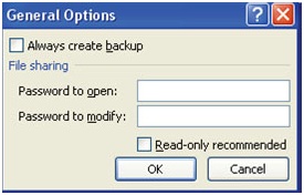 برای حفاظت از یک سند و داده های آن، می توان برای آنها رمز عبور تعیین کرد. برای ایجاد رمز عبور برای یک سند، ابتدا سند مورد نظرتان را باز کنید. پس از اینکه تغییر یا تغییرات مورد نظرتان را اعمال کردید، به هنگام ذخیره سازی، گزینه Save as را انتخاب کنید. (با کلیک بر روی دکمه Office می توانید به گزینه Save as دسترسی داشته باشید). اکنون در پنجره باز شده، بر روی دکمه Tools کلیک کرده و گزینه General Option را انتخاب کنید.