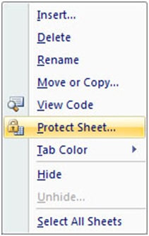 این بار قصد داریم به کاربران اجازه دهیم که به راحتی Workbook را باز کنند، اما فقط کاربران خاصی بتوانند اطلاعات آن را تغییر دهند. برای این منظور از دستور محافظت Sheet استفاده می کنیم. برای اینکار پس از باز کردن Workbook روی زبانه Sheet مورد نظر، کلیک راست کنید و از منوی باز شده، گزینه Protect Sheet را انتخاب کنید.