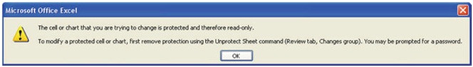 مجددا رمز را وارد کرده و روی دکمه OK کلیک کنید. هر کاربری که این Workbook را باز کند، می تواند اطلاعات آن را مشاهده کرده و سلول های آن را انتخاب کند. اما هنگام اعمال هر نوع تغییر، پیغام هشدار ظاهر می شود.
