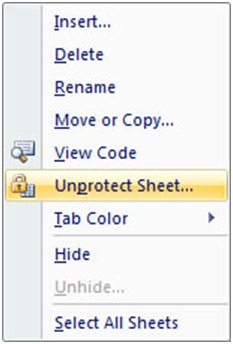 کاربری که رمز عبور را می داند، می تواند Sheet را از حالت محافظت شده خارج کرده و تغییرات موردنظر خود را روی داده ها اعمال کند. برای از محافظت خارج کردن (Unprotect) یک Sheet روی زبانه Sheet مورد نظر، کلیک راست کنید و از منوی باز شده، گزینه Unprotect Sheet را انتخاب کنید.