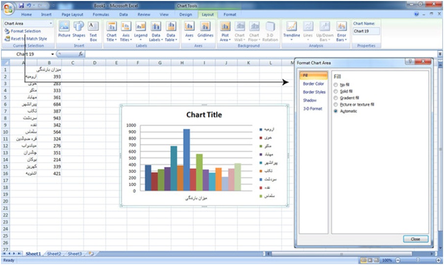 در پنجره فوق از گزینه های بخش Series Option به منظور تعیین اندازه و وضعیت همپوشانی سری ها، از گزینه های بخش Fill برای رنگ آمیزی سری ها، از گزینه های بخش Border Color برای رنگ آمیزی دور خط سری ها، از گزینه های بخش Border Styles برای تعیین مدل خط دور سری ها، از گزینه های بخش Shadow برای تنظیمات سایه و از گزینه های بخش ۳-D Format نیز برای تنظیمات سه بعدی مانند جنس، مقطع، عمق، نورپردازی و... استفاده می شود.