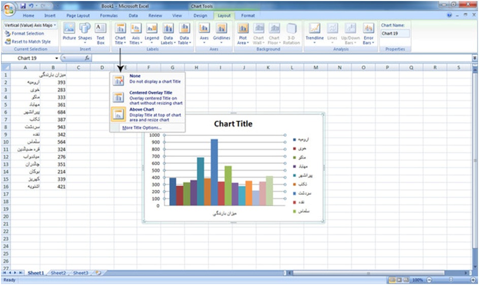 هر نمودار رسم شده در اکسل به طور پیش فرض دارای يک عنوان است كه بالای آن نمايش داده مي شود. اگر می خواهید این عنوان را از نمودار حذف کنید و یا وضعیت نمایش آن را تغییر دهید، بر روی گزینه Chart Title کلیک کنید. در این صورت کادر کوچکی زیر آن باز می شود.