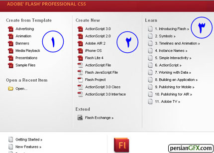 هنگامی که برنامه فلش را باز می کنید، در ابتدا پنجره زير ظاهر می شود. این پنجره شامل سه قسمت اصلی می باشد: