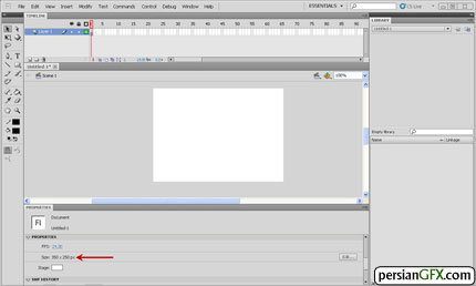 ابعاد پیش فرض صفحه طراحی در فلش CS5، 400X550 می باشد که در ادامه خواهیم گفت چگونه می توانید این ابعاد را تغییر داده و ابعاد مورد نظرتان را به عنوان ابعاد پیش فرض در برنامه تعریف کنید. در شکل زیر، ابعاد پیش فرض صفحه طراحی یا سند را تبدیل به ابعاد 250X350 کرده ایم. در قسمت پایین برنامه و در پنل خصوصیات ابعاد صفحه را مشاهده می کنید.