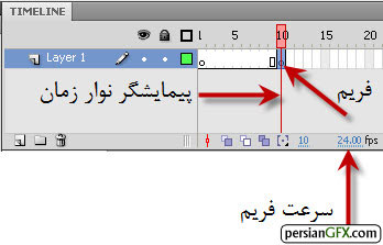 نوار زمانی، شامل چهارخانه هایی به نام فریم است. هر فریم در واقع نشان دهنده یک تصویر ثابت است. اگر تصاویر متوالی در این فریم ها رسم کنیم و سپس آنها را به سرعت نمایش دهیم، یک تصویر متحرک ایجاد می شود. در واقع نوار زمان مهمترین قسمت برنامه فلش می باشد که با آشنایی و درک کامل آن، قادر خواهید بود اشیای مورد نظر خود را با جلوه ها و سرعت های دلخواه متحرک کنید.