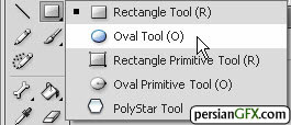 رسم دايره با ابزار Oval: براي رسم دايره با ابزار Oval، چند لحظه كليد ماوس را روي ابزار Rectangle‌ قرار دهيد تا ابزارهاي ديگر داخل آن نيز آشكار شوند. ابزار Oval را انتخاب نماييد.