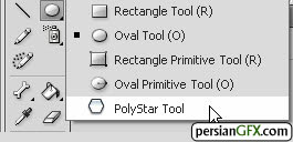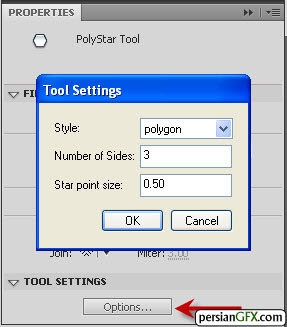 رسم چند ضلعي و ستاره با ابزار PolyStar: براي رسم چند ضلعي و ستاره توسط اين ابزار، كليد ماوس را روي ابزار چند ضلعي فشار دهيد تا ابزارهاي داخل آن نيز آشكار شوند. ابزار PolyStar را انتخاب نماييد.