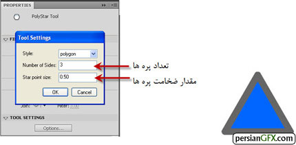 در قسمت هاي زير تعداد اضلاع ستاره يا چند ضلعي و ضخامت پره ها را به ترتيب مشخص كنيد. به عنوان مثال، براي رسم مثلث، گزينه polygon را انتخاب كرده و مقدار 3 را در قسمت تعداد اضلاع وارد كنيد. براي رسم دقيقاً مانند رسم شكل هاي گذشته عمل كنيد.