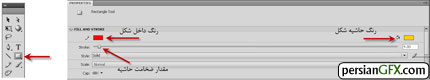رسم چهارضلعي با ابزار Rectangle: ابزار Rectangle را در جعبه ابزار انتخاب كنيد. به منوي Properties