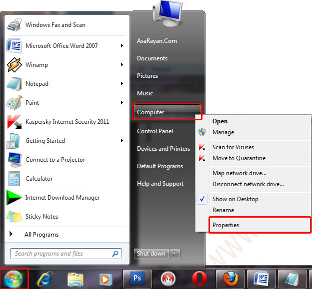 1.منوي Start را باز كرده و بر روي گزينه Computer كليك راست كرده گزينه Properties را انتخاب كنيد (از تصوير كمك بگيريد)