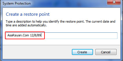 4.روي دكمه Create كليك كرده و توضيحي به دلخواه براي Restore point تان تايپ كنيد تا System Restore راحت تر آن را از ساير Restore point ها تشخيص دهد، در انتها روي دكمه Create كليك كنيد .