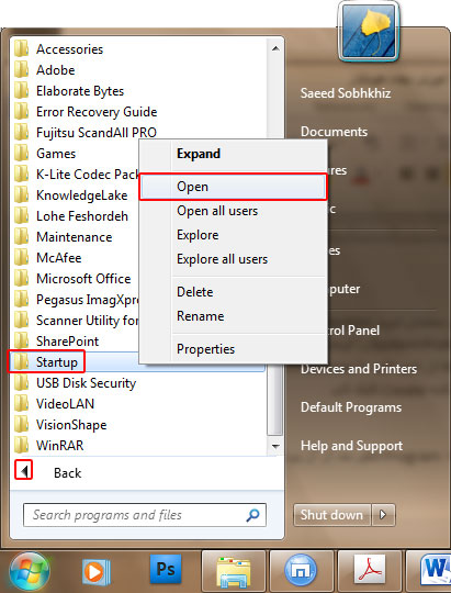 بسيار خوب حال بر روي منوي Start كليك كرده همانند تصوير زير گزينه All Program و بعد از آن پوشه Startup كليك راست كرده گزينه Open را انتخاب كنيد.