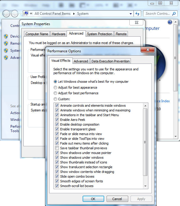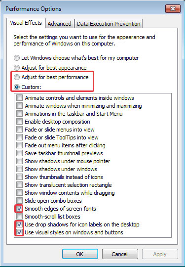 4. بعد از کلیک بر روی تب Settings صفحه performance options ظاهر می شود.همانطور که می بینید در این قسمت 4 گزینه وجود دارد . بهترین گزینه برای بالا بردن سرعت لود شدن ویندوز انتخاب Adjust for best perfomance می باشد . گزینه مورد نظر را انتخاب کرده تا همه ویژگیهای جلوه های بصری ویندوز 7 غیر فعال شود .پیشنهاد ما به شما انتخاب گزینه custome  می باشد و در مرحله بعد  تیک 3 گزینه مشخص شده در تصویر زیر را فعال کردن . برای مشاهده تغییرات اعمال شده سیستم را یکبار از نو راه اندازی کنید یا می توانید برای راحتی کار ویندوز را log of نمایید .