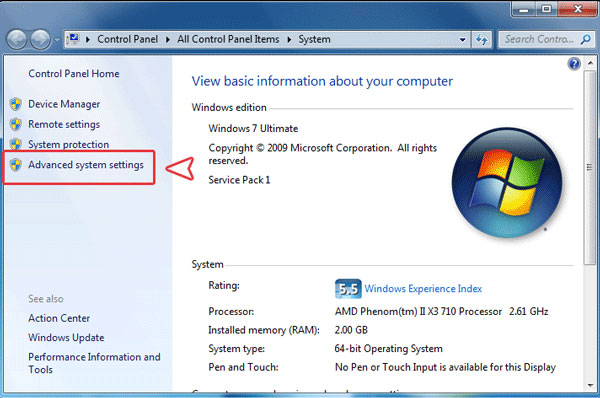 2. در قسمت سمت چپ پیوندها را مشاهده می کنید ، روی گزینه Advanced System Settings کلیک کنید تا ویزارد System Properties ظاهر شود .