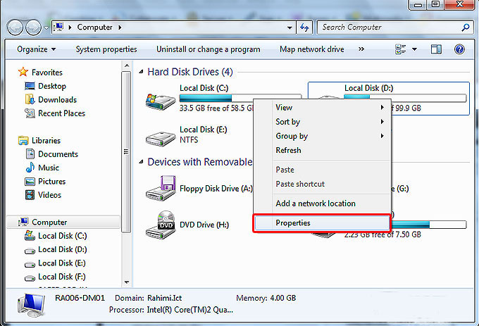 2. روي درايوي كه مي خواهيد مورد بررسي و اسكن قرار دهيد كليك راست كرده و گزينه Properties را انتخاب كنيد.