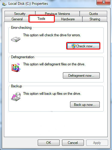 3. از ويزارد باز شده تب Tools را انتخاب سپس در قسمت Error checking كليد Check now را انتخاب كنيد.