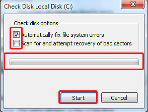 4. براي اينكه هم خطاهاي فايل ها بررسي شود و هم خطاهاي فيزيكي ، جهت برطرف كردن مشكلات فايل ها و وپوشه ها و بازيابي خطاهاي فيزيكي هر دو گزينه را تيك زده و بر روي گزينه Start كليك كنيد.