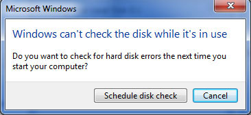 6. اگر ويندوز يا برنامه اي در حال استفاده از درايو باشد پنجره زير نمايش داده مي شود . روي كليد Schedule disk check كليك كنيد .