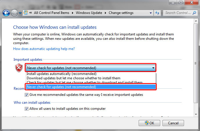 Windows Update را از لیست باز شده گزینه ( Never check for