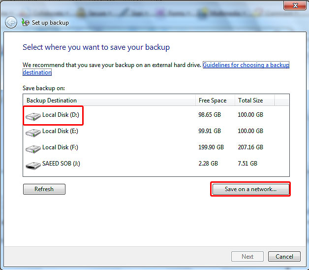 تذكر : براي ذخيره كردن اين پشتيبان در يك محل مشخص روي شبكه مي توانيد بر روي كليد Save on a Network كليك كنيد .تنها ويرايش هاي Professional .Ultimate و Enterprice ويندوز 7 مي تواند روي شبكه پشتيبان تهيه كند.