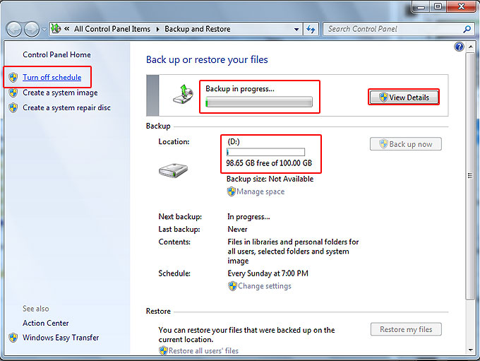در صورتي كه خواستيد گرفتن پشتيبان را متوقف كنيد بر روي كليد View Details كليك كرده و كليد Stop را بزنيد.