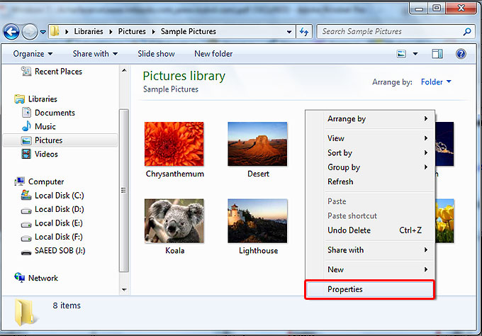 2. روي يك فضاي خالي از پنجره آن پوشه كليك راست كرده و گزينه Properties را انتخاب كنيد .