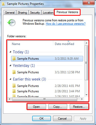 نكته : Previous Versions هايي كه بوسيله Windows Backup بوجود آمده اند را نمي توانيد باز كنيد (براي تشخيص اين نوع Previous Versions ها به ستون Location مراجعه كنيد ) اما مي توانيد بازيابي كنيد .تنها ورژني را مي توانيد باز كنيد كه به عنوان بخشي از يك Restore Point ذخيره شده باشد .