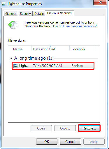 نكته : اگر مي خواهيد يك Previous versions يك فايل يا پوشه را از يك پشتيبان بازيابي كنيد ، پس از انتخاب Previous versions مورد نظر و كليك روي دكمه Restore ، ويندوز ويزارد Restore File را باز مي كند ، و مي بايست مراحل آن ويزارد را طي كنيد . براي بازيابي Previous versions موجود بر روي يك پشتيبان مي بايست درايو يا وسيله اي كه پشتيبانتان را روي آن ذخيره شده قابل دسترسي باشد .