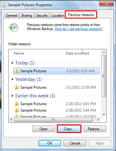 1.در زبانه Previous Versions يكي از Previous Versionsهاي موجود را انتخاب كرده و در صورت امكان روي دكمه Copy كليك كنيد.