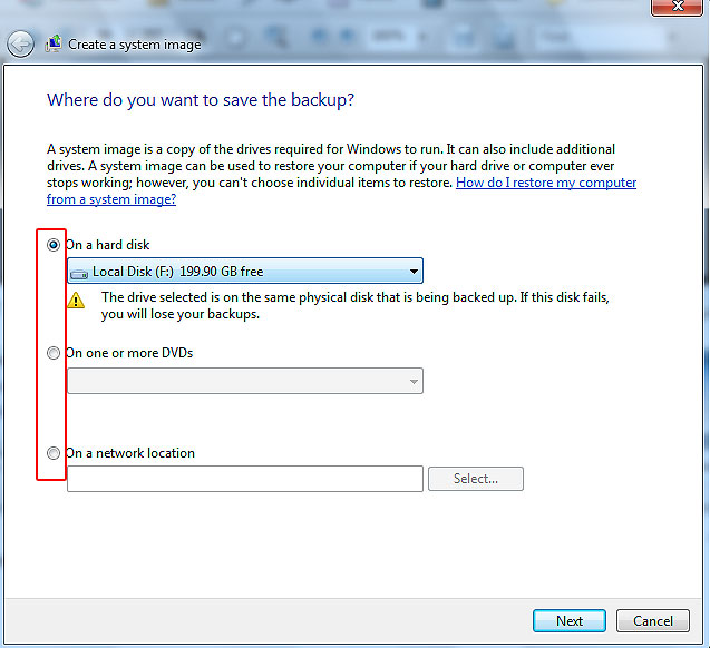 4. اگر مي خواهيد System Image را روي يك درايو يا پارتيشن ذخيره كنيد ، تنها مي توانيد آن را روي يك درايو /پارتيشن غير از درايو / پارتيشن كه ويندوز 7 روي آن نصب است ذخيره كنيد ، نمي توانيد آن را روي درايو C: ذخيره كنيد.