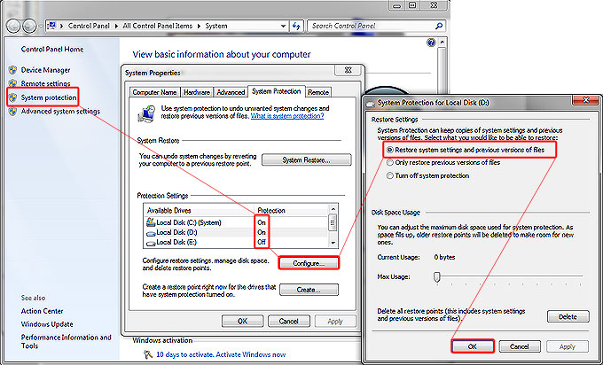 گزینه Only restore previous of files : برای روشن کردن System Protection فقط برای ورژن های قبلی فایل ها