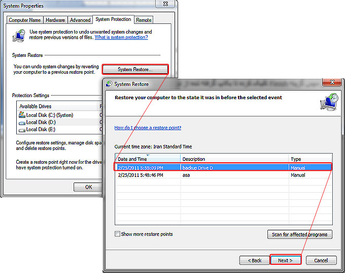 همانطور که مشاهده کردید یک Restore Point ساخته شد برای باز گرداندن Restore Point ساخته شده در همان صفحه بر روی گزینه System Restore… کلیک کرده، از ویزارد باز شده بر روی Next کلیک کنید شما می بینید که Restore Point ساخته شده با تاریخ و زمان در کادر زیر مشخص شده است کافیست بعد از انتخاب Restore Point مورد نظر بر روی Next و سپس گزینه Finish کلیک کرده تا بکاپ گرفته شده از درایو مورد نظر را به تاریخ مورد نظر باز گرداند.