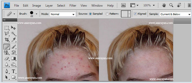 ابزارSpot Healing Brush شبیه Healing Brush عمل می کند . با این تفاوت که این ابزار نیاز به نمونه برداری از اطراف تصویر توسط کلید Alt ندارد و اتوماتیک از اطراف نقطه ای که نقص دارد نمونه برداری می کند .منبع: آسا رایان