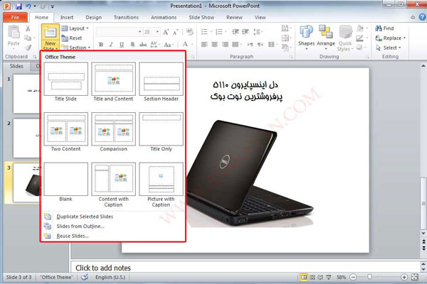 دوم بالای صفحه گزینه New Slides را انتخاب و یکی از فرمت های نمایش را انتخاب