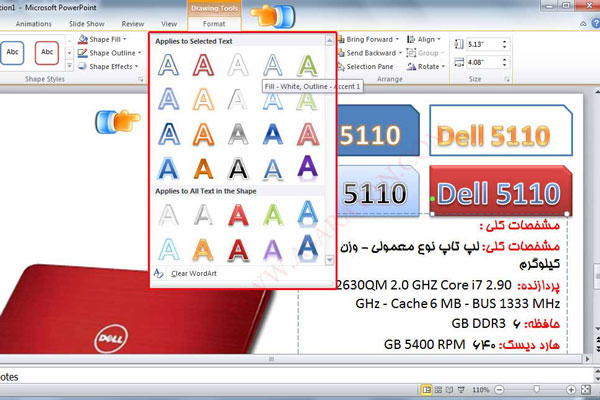 به شکل دیگر Drawing Tools می باشد . شما در این برگه می توانید ظاهر متن و کادر