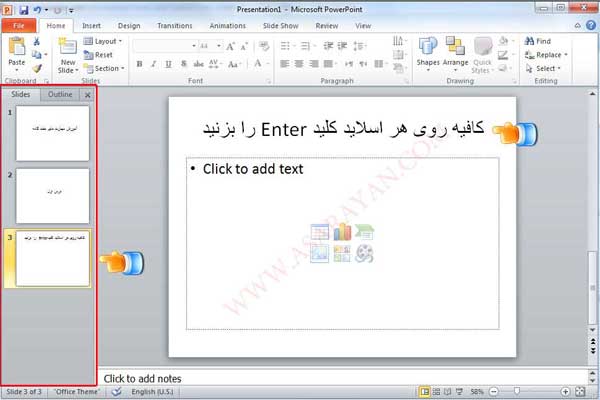 برای ایجاد اسلاید در بین دو اسلاید کلید Enter را بزنید .