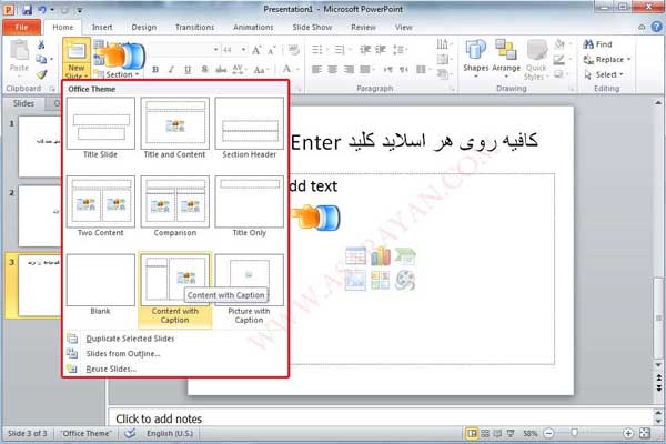 دو روش برای ایجاد اسلاید جدید وجود داره اول در پنجره Slide روی اسلاید خودتون کلید Enter را بزنید