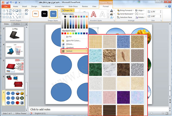 7. برای وارد کردن بافت مورد نظر نیز به همین ترتیب گزینه Shape Fill را انتخاب و از لیست باز شده گزینه Texture را انتخاب کنید .