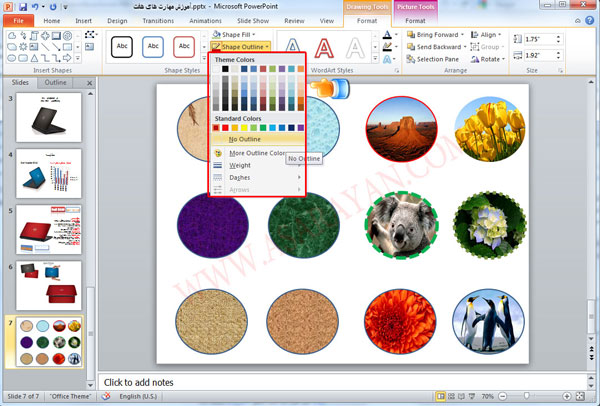 8. برای تغییر رنگ خط دور دایره ها نیز در تب Drawing Tools از گزینه Shape Outline می توانید استفاده کنید .