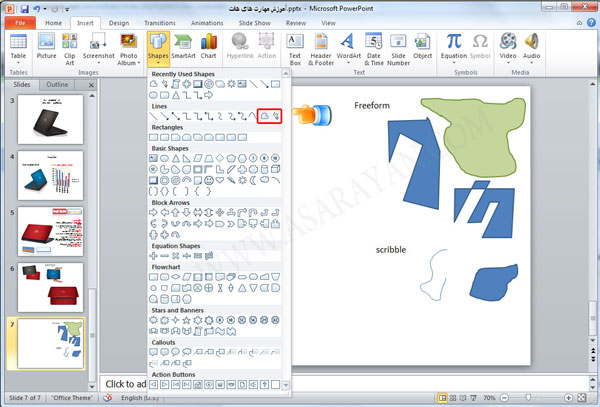 تفاوت این دو ابزار در این است که با ابزار FreeFormشما می توانید با درگ کردن یا ایجاد نقاط در اسلاید به شکل دلخواه خود برسید اما ابزار Scribble این امکان را برای شما فراهم نمی کند یعنی اگر شما در حال درگ کردن دستتان از روی کلیک راست ماوس برداشته شود کادر شما همان جا نیمه کاره باقی می ماند. برای درک خودتان یکبار این تمرین را با هر دو ابزار انجام دهید .