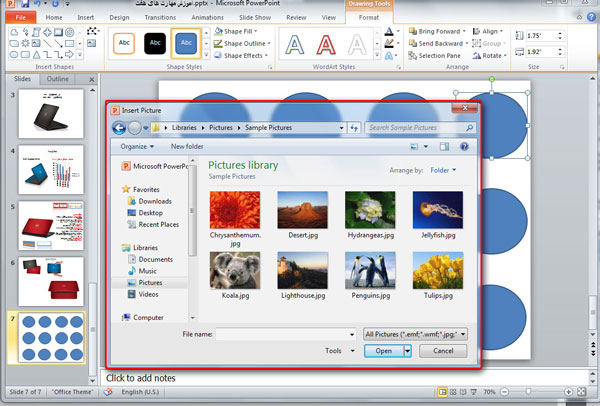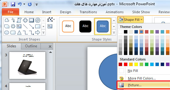 6. می خواهیم داخل دایرهای ترسیم شده یک تصویر یا بافت دلخواه را وارد کنیم برای انجام اینکار گزینه Shape Fill را انتخاب و بر روی گزینه Picture کلیک کنید .