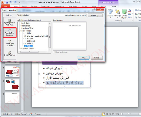 اگر می خواهید به یکی از صفحات اسلاید خود لینک داشته باشید گزینه Place In this Document را انتخاب کرده و لیست اسلایدهای طراحی شده را به شما نمایش می دهد با انتخاب هر کدام از آنها و کلید بر روی گزینه Ok لینک شما ساخته می شود .