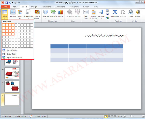 بر روی تب Insert کلیک کرده و گزینه table را انتخاب کنید . یک صفحه کوچک برای شما نمایش داده می شود .خانه های کوچکی که در تصویر زیر مشاهده می کنید ستون های یک جدول می باشد بای مثال می خواهیم یک جدول 4×4 ایجاد کنیم کافیست در جهت های عمودی و افقی 4 مربع را انتخاب نمایید .